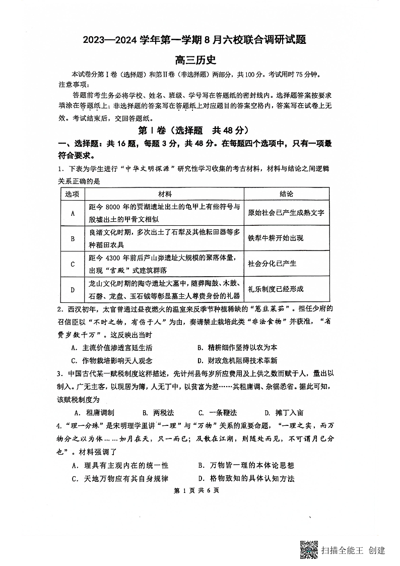 江苏省南京市六校联合体2024届高三上学期8月调研历史