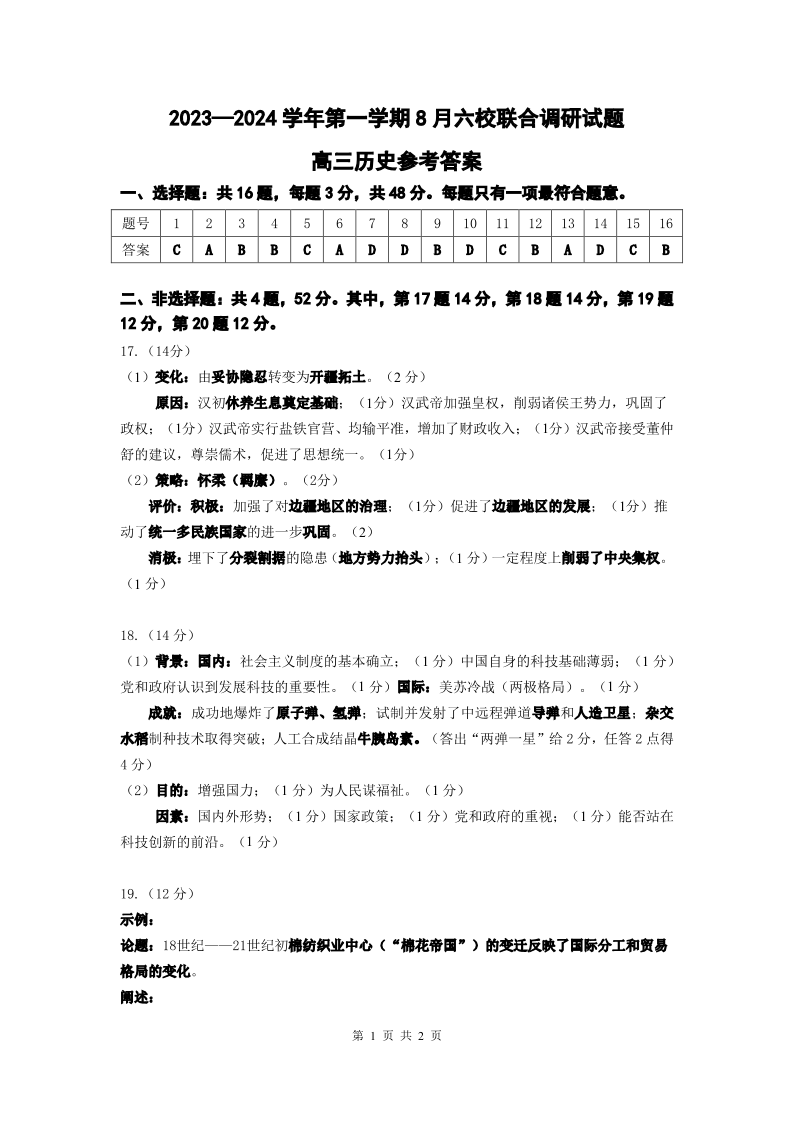 江苏省南京市六校联合体2024届高三上学期8月调研历史答案