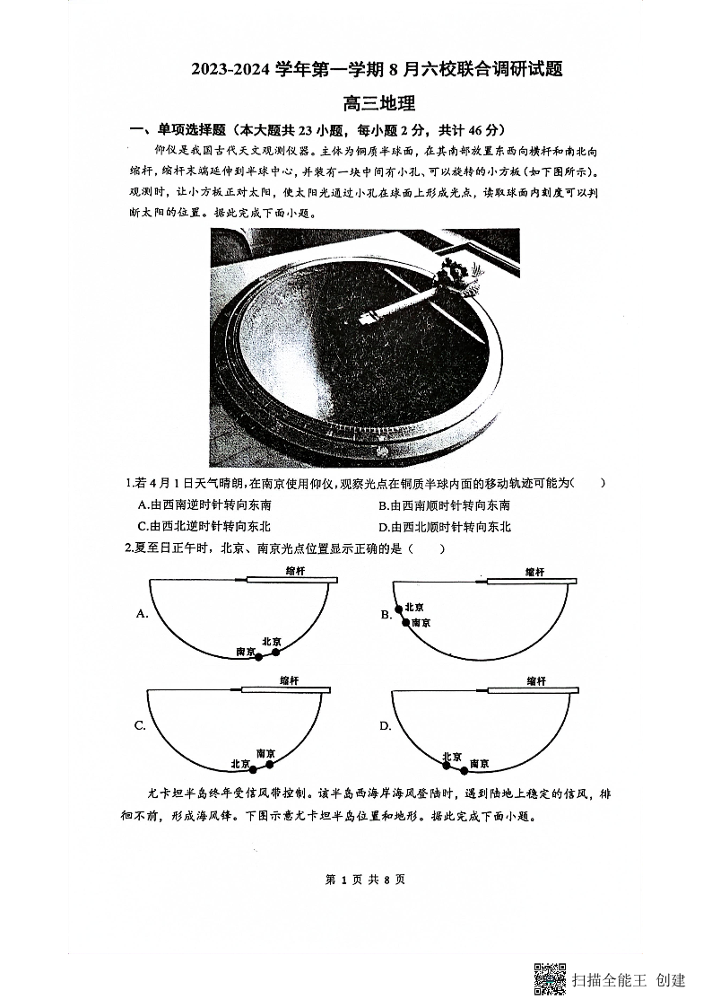 江苏省南京市六校联合体2024届高三上学期8月调研地理