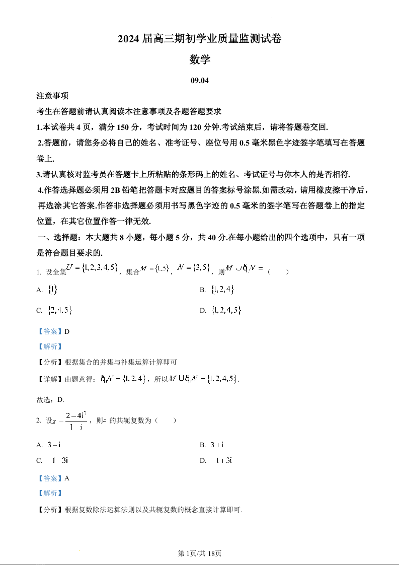 江苏省南通市海安市2024届高三上学期开学考试数学(精品解析版)