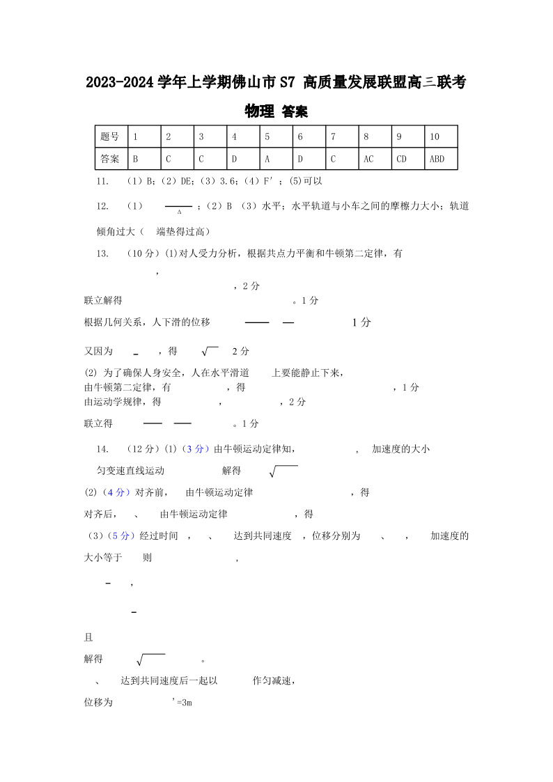 广东省佛山市S7高质量发展联盟2024届高三上学期联考物理答案