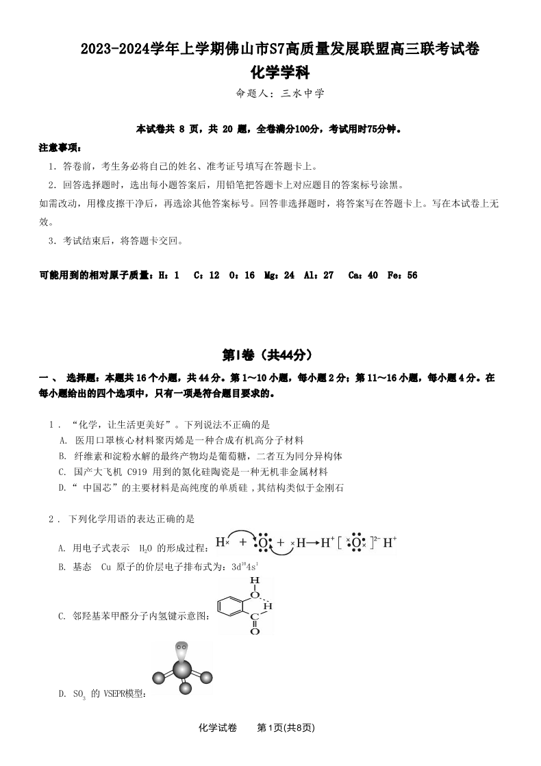 广东省佛山市S7高质量发展联盟2024届高三上学期联考化学