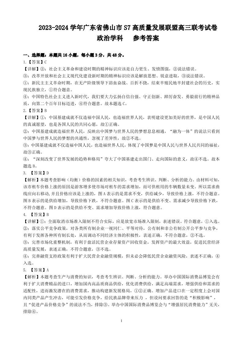 广东省佛山市S7高质量发展联盟2024届高三上学期联考政治答案