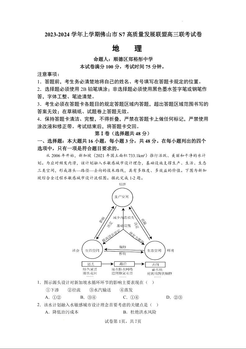 广东省佛山市S7高质量发展联盟2024届高三上学期联考地理