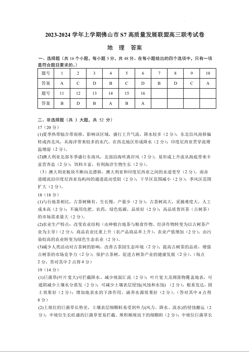 广东省佛山市S7高质量发展联盟2024届高三上学期联考地理答案