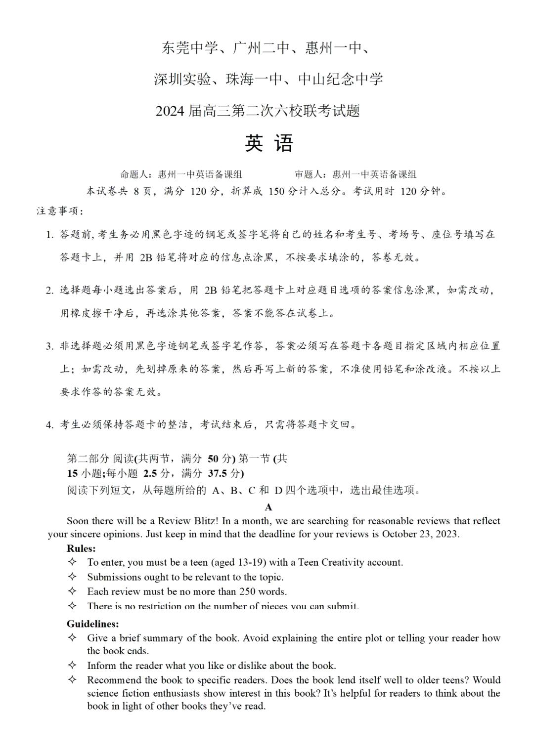 广东省2024届高三第二次六校联考英语