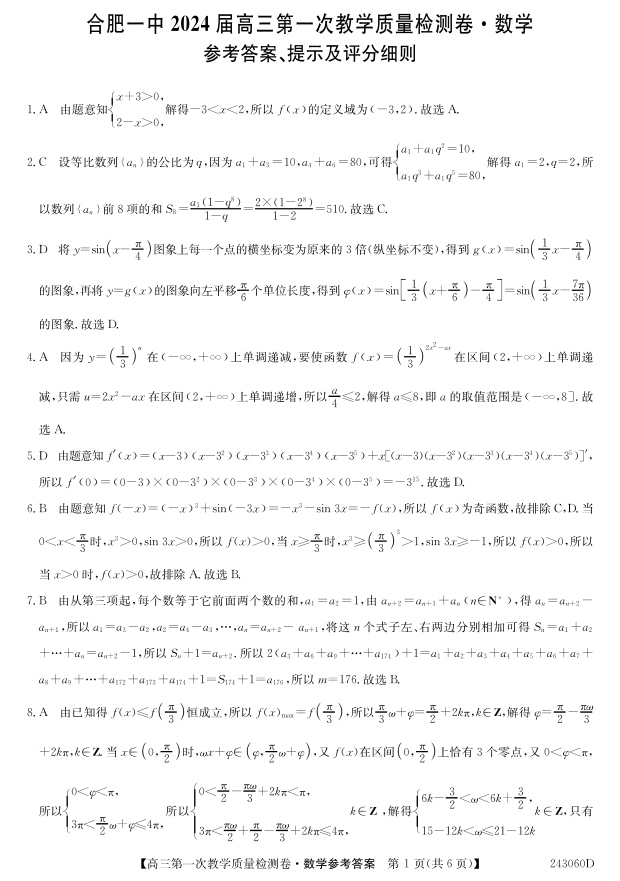 安徽省合肥市第一中学2024届高三上学期第一次教学质量检测数学答案