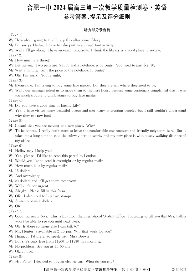 安徽省合肥市第一中学2024届高三上学期第一次教学质量检测英语答案