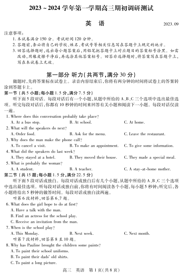 江苏省苏州市2024届高三上学期期初调研测试英语