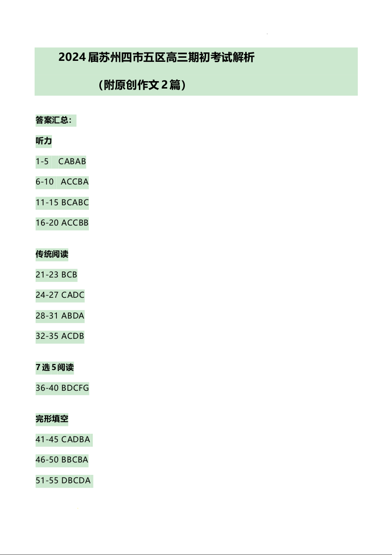 江苏省苏州市2024届高三上学期期初调研测试英语答案