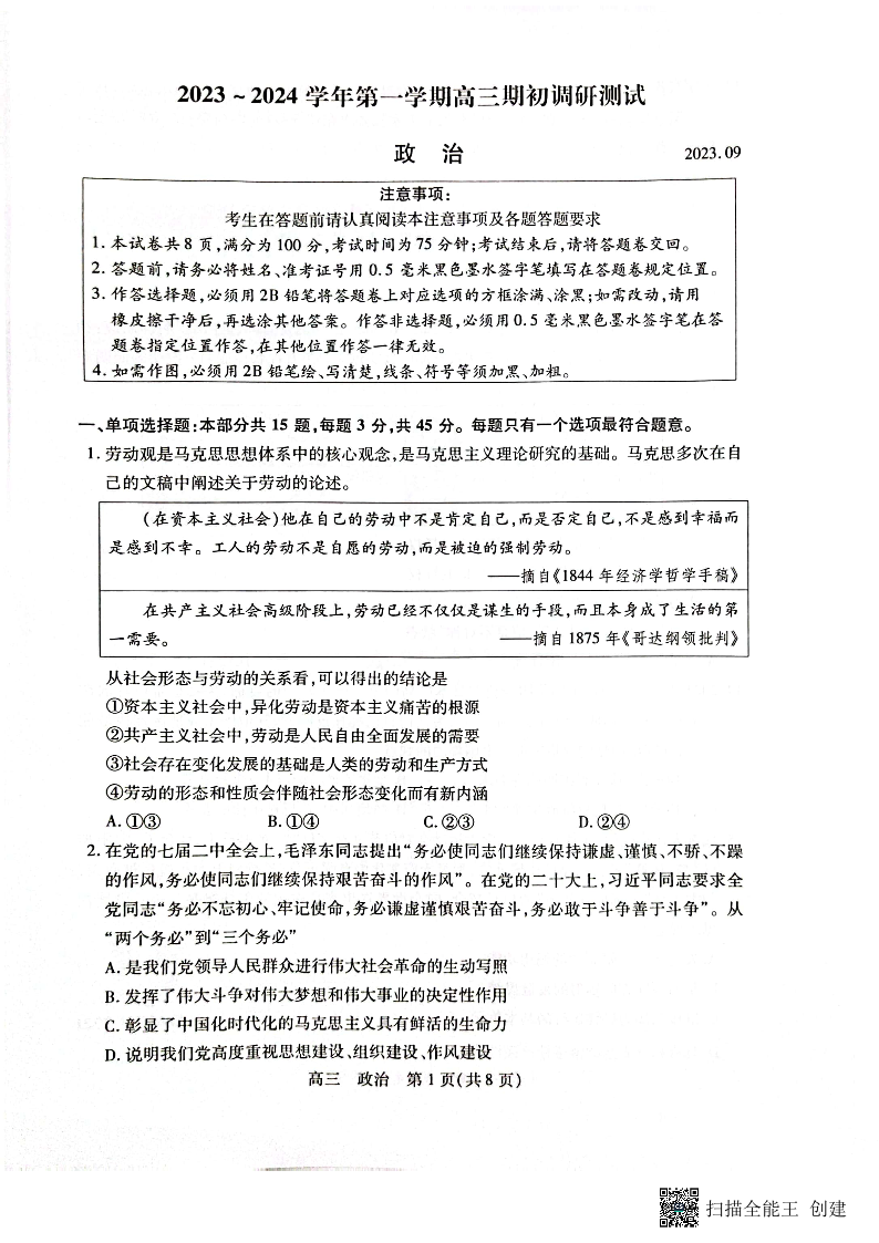 江苏省苏州市2024届高三上学期期初调研测试政治