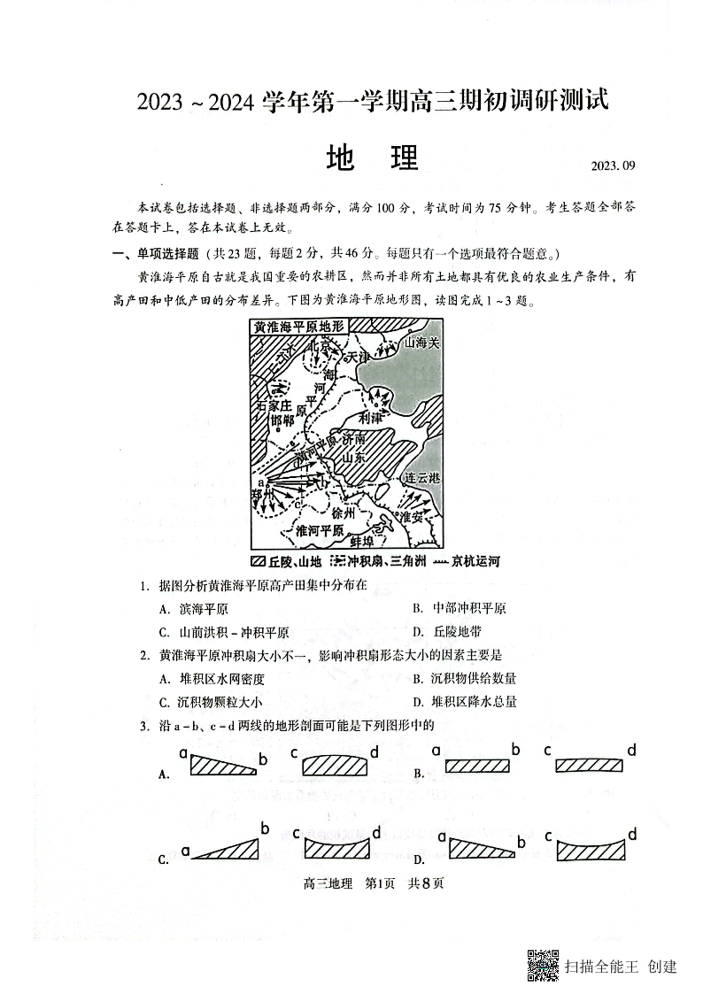 江苏省苏州市2024届高三上学期期初调研测试地理