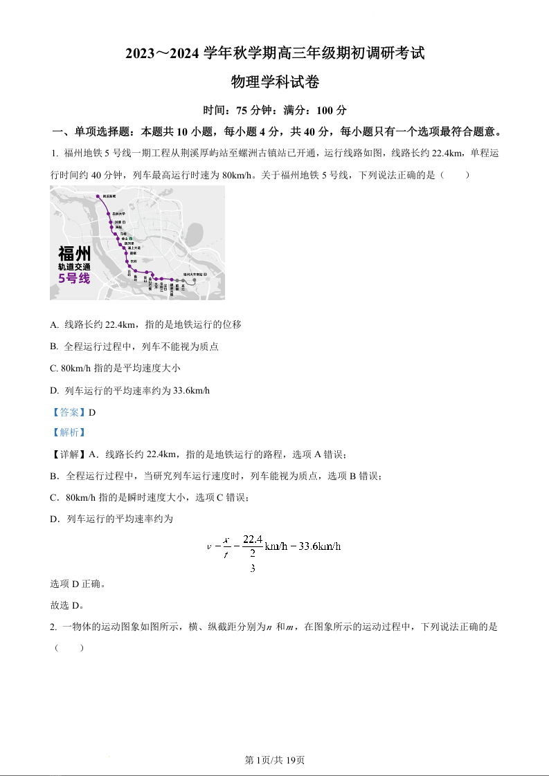 江苏省泰州中学2024届高三上学期期初调研考试物理(精品解析版)