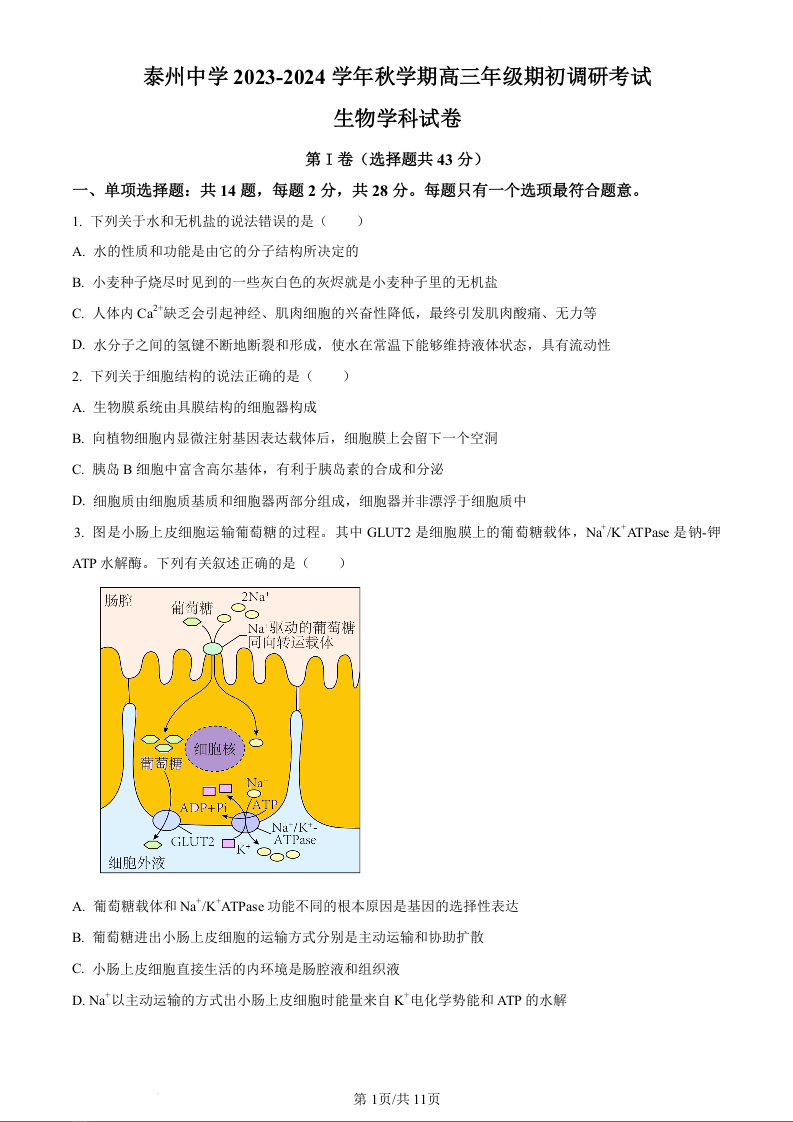 江苏省泰州中学2024届高三上学期期初调研考试生物(原卷版)