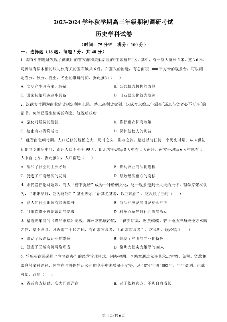 江苏省泰州中学2024届高三上学期期初调研考试历史(原卷版)