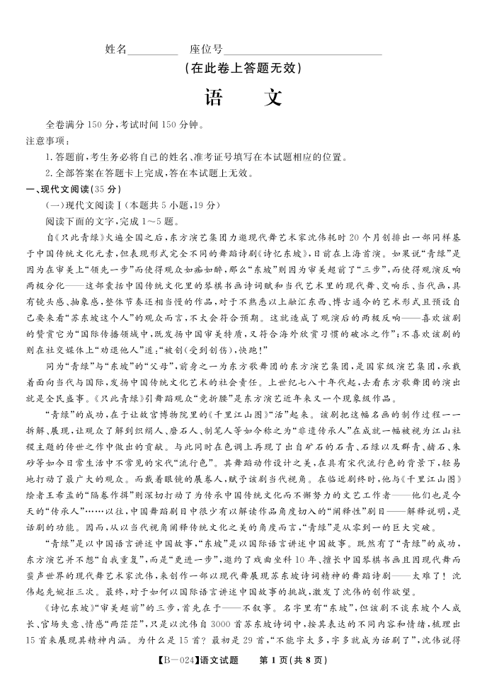 安徽省皖江名校2024届高三10月阶段性考试语文