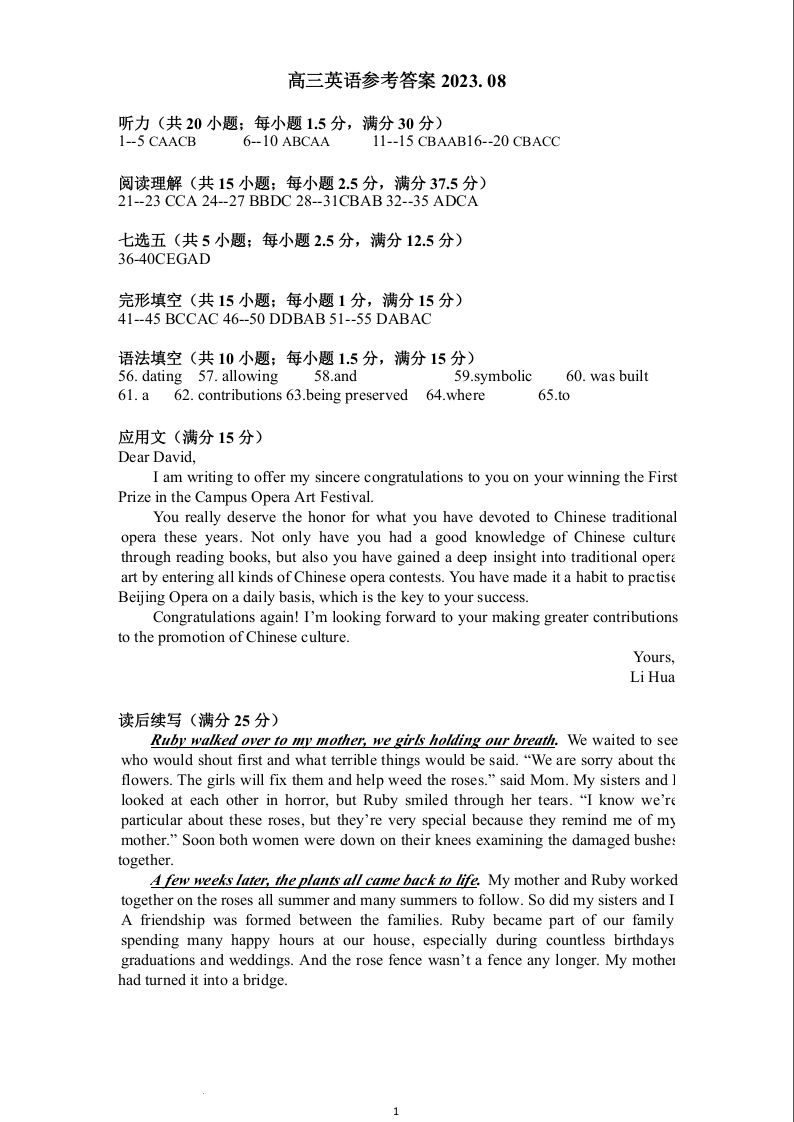 江苏省镇江地区2024届高三上学期期初考试英语答案