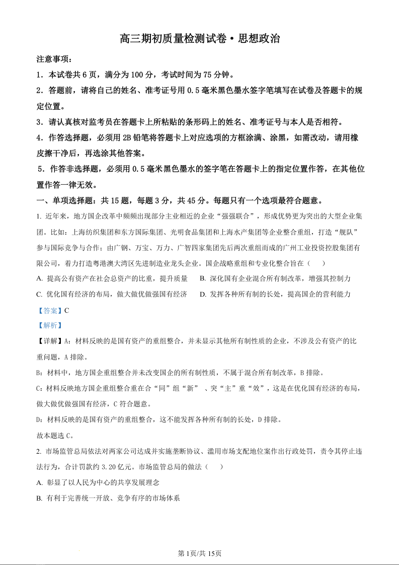 江苏省镇江地区2024届高三上学期期初考试政治(精品解析版)