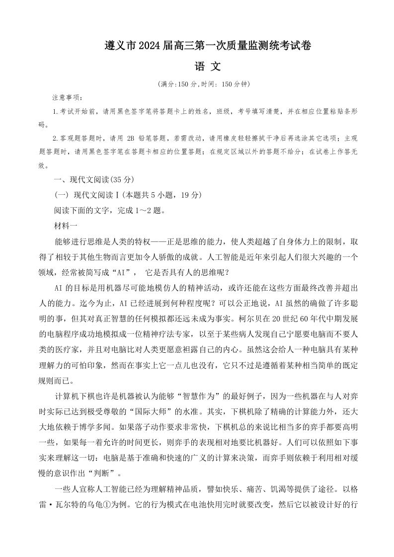 贵州省遵义市2024届高三上学期第一次市质量监测语文