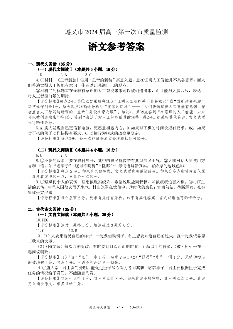 贵州省遵义市2024届高三上学期第一次市质量监测语文答案