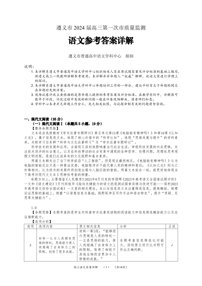 贵州省遵义市2024届高三上学期第一次市质量监测语文答案(精讲版)