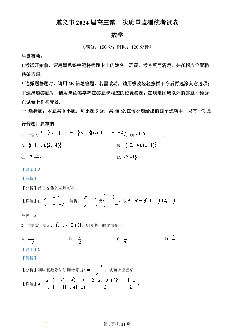 贵州省遵义市2024届高三上学期第一次市质量监测数学(精品解析版)