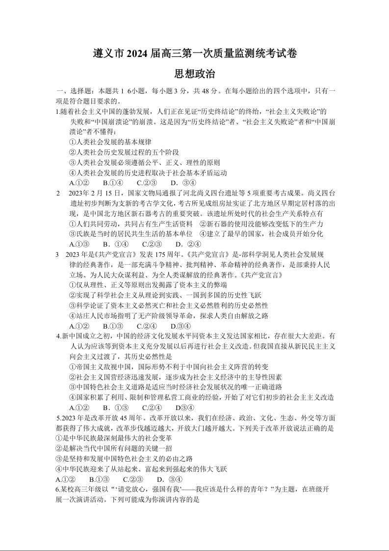 贵州省遵义市2024届高三上学期第一次市质量监测政治+答案