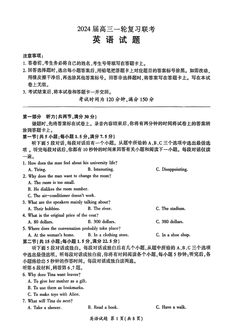 江西省百师联盟2024届高三上学期一轮复习联考试题英语