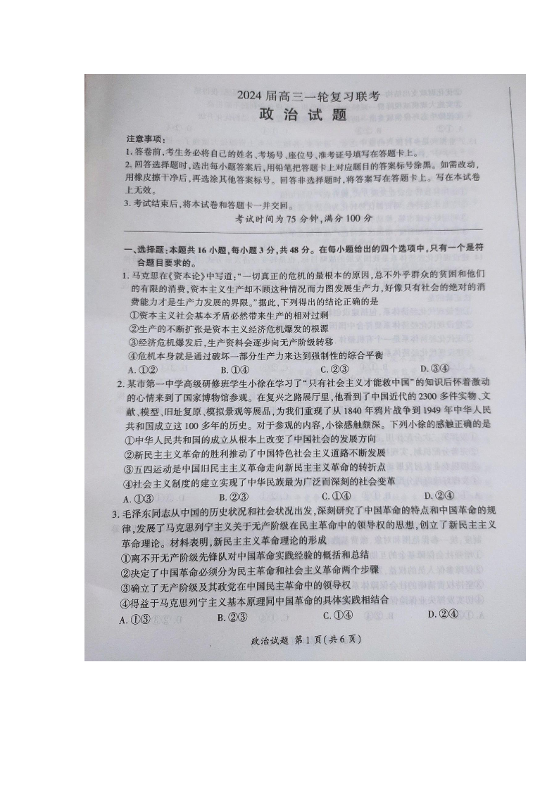 江西省百师联盟2024届高三上学期一轮复习联考试题政治+答案