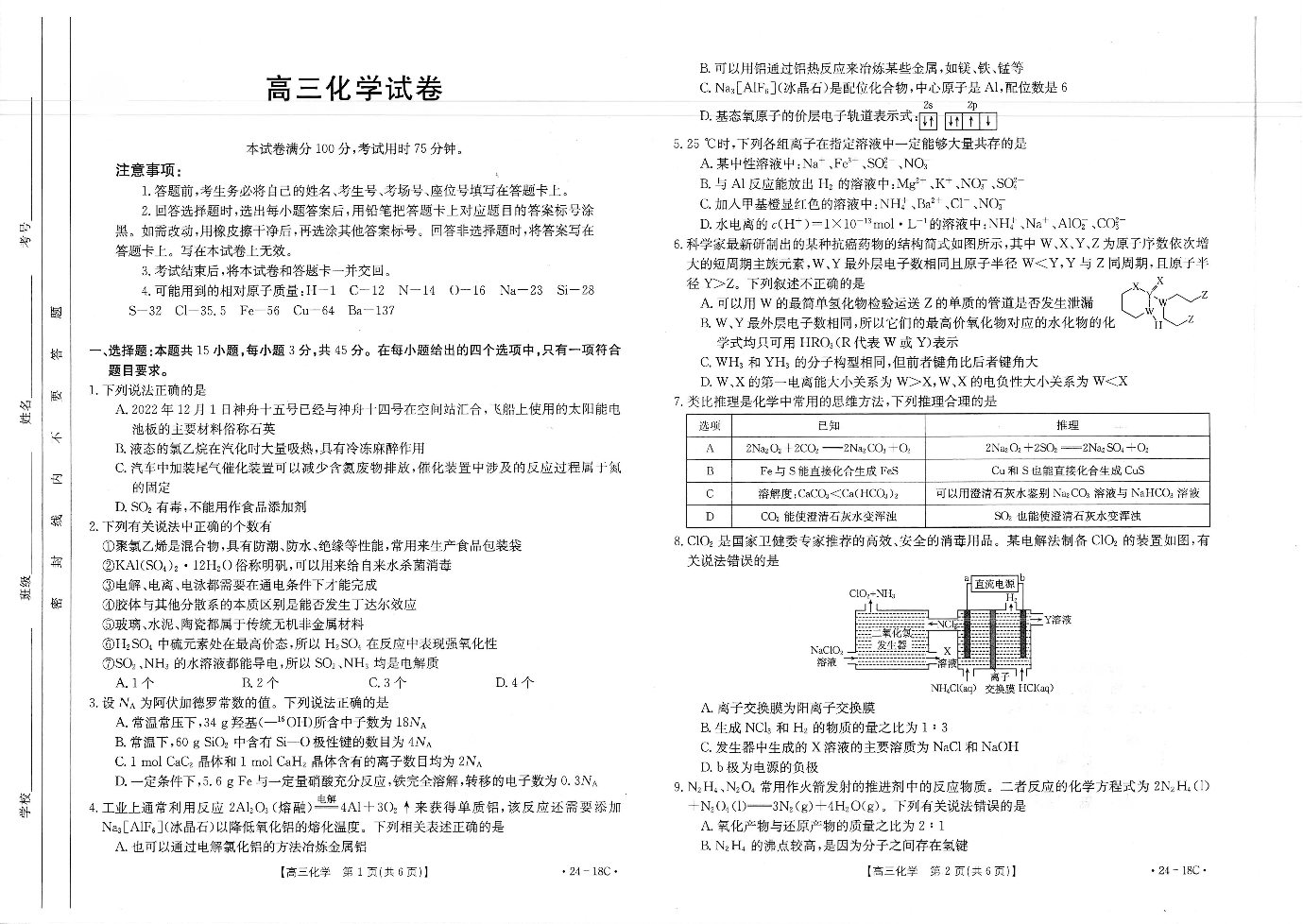 辽宁省2024届金太阳高三上学期开学摸底考试(24-18C)化学