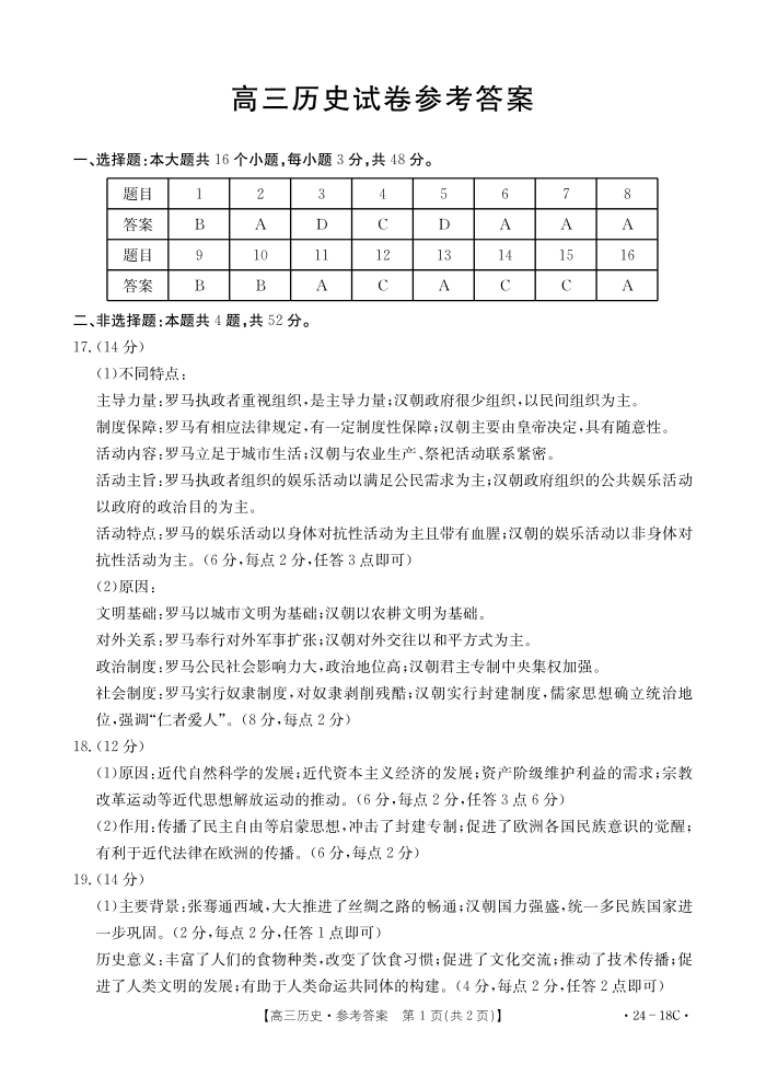 辽宁省2024届金太阳高三上学期开学摸底考试(24-18C)历史答案
