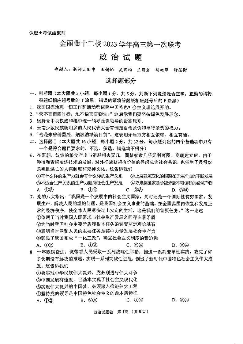 浙江省金丽衢十二校2024届高三上学期12月联考政治