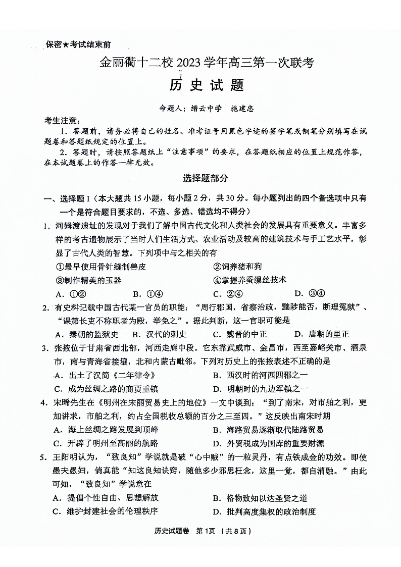 浙江省金丽衢十二校2024届高三上学期12月联考历史