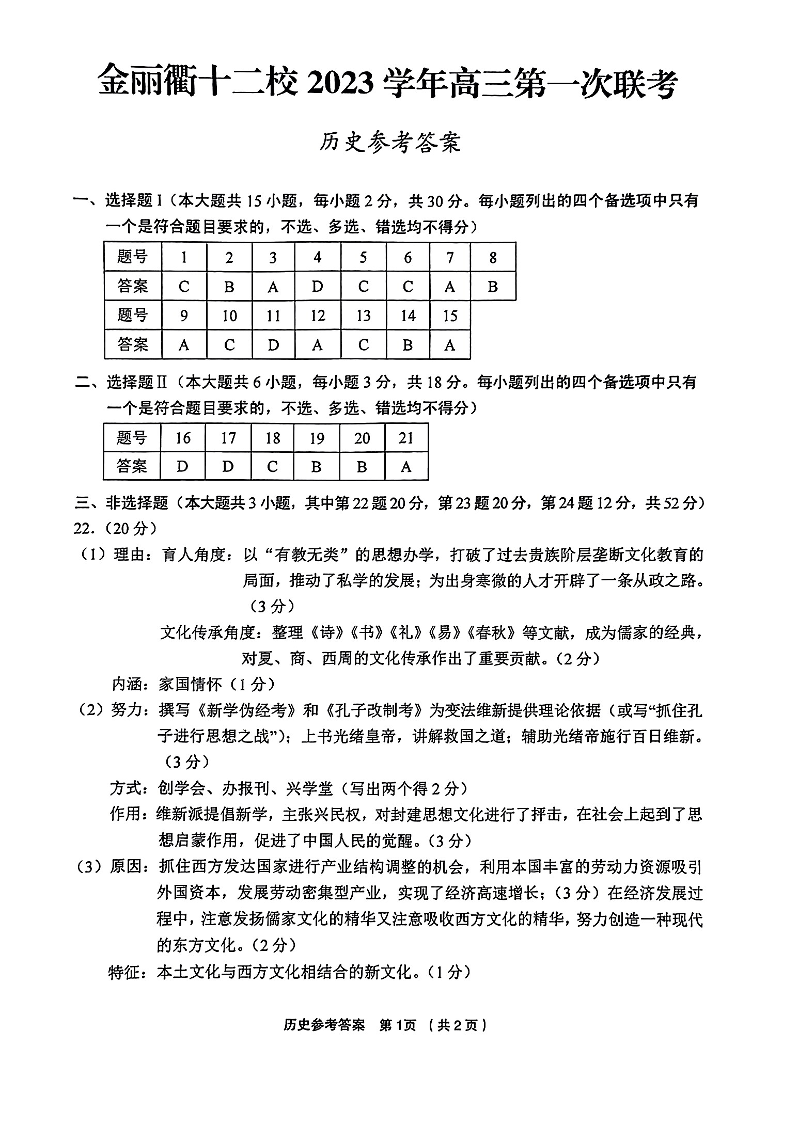 浙江省金丽衢十二校2024届高三上学期12月联考历史答案