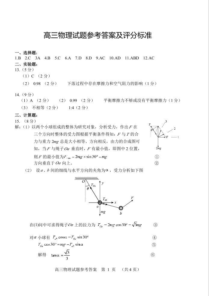 山东省泰安肥城市2024届高三上学期9月阶段测试物理答案