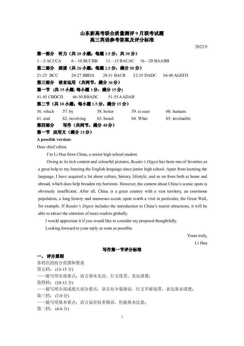 山东省新高考联合质量测评2024届高三上学期开学联考英语答案