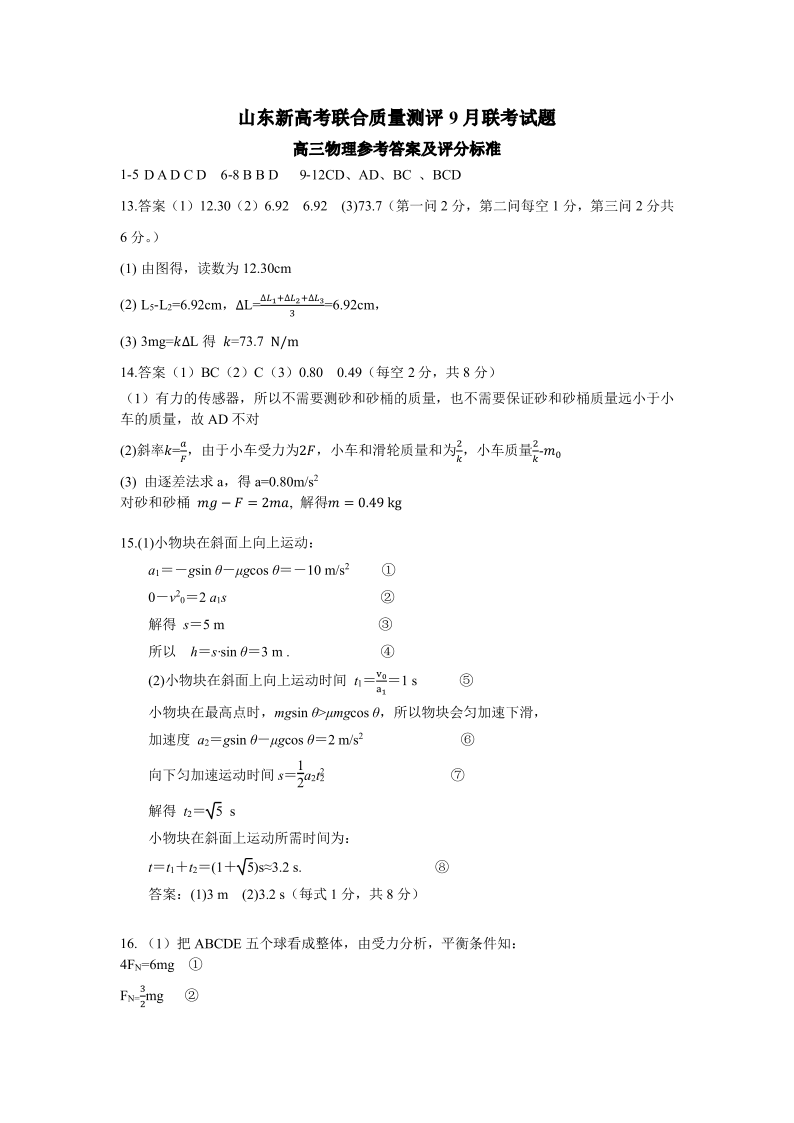 山东省新高考联合质量测评2024届高三上学期开学联考物理答案