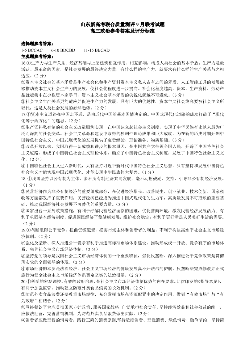 山东省新高考联合质量测评2024届高三上学期开学联考政治答案