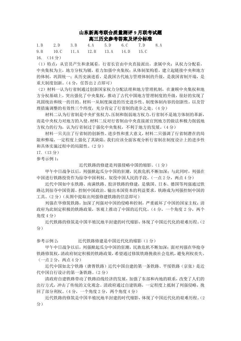山东省新高考联合质量测评2024届高三上学期开学联考历史答案