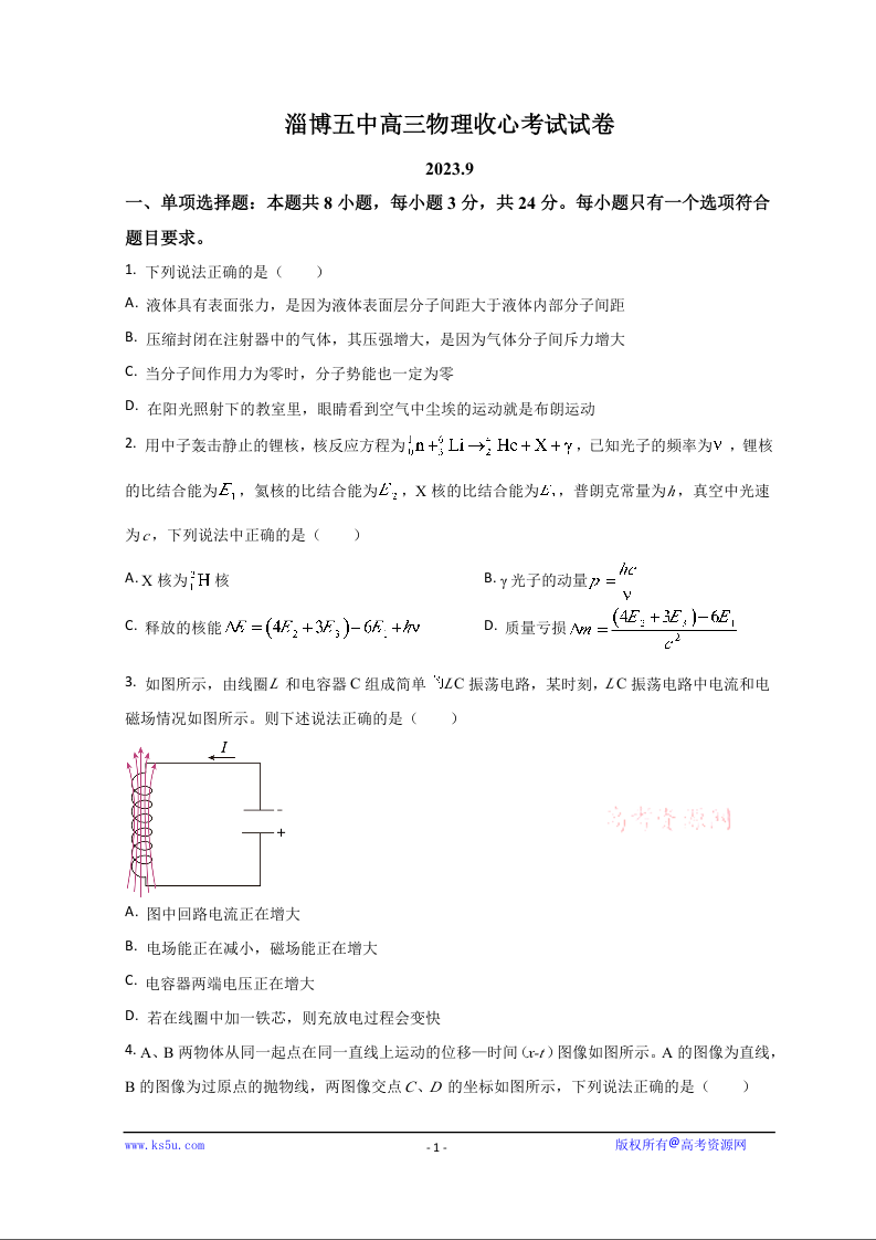 山东省淄博市第五中学2024届高三上学期开学物理(原卷版)