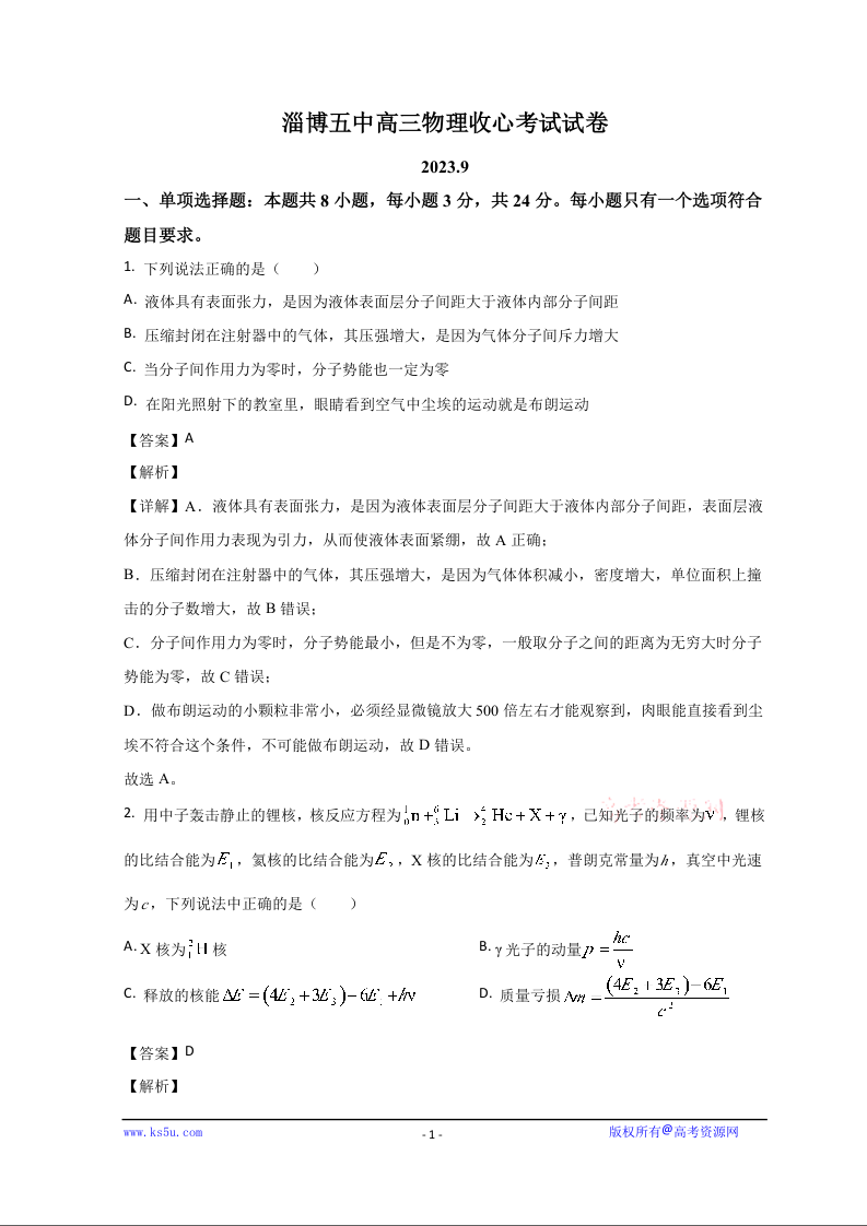 山东省淄博市第五中学2024届高三上学期开学物理(解析版)