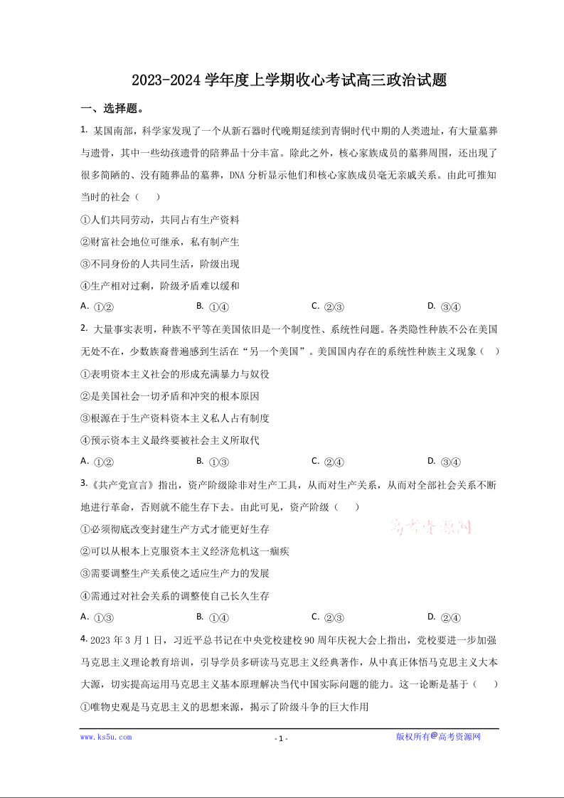 山东省淄博市第五中学2024届高三上学期开学政治(原卷版)