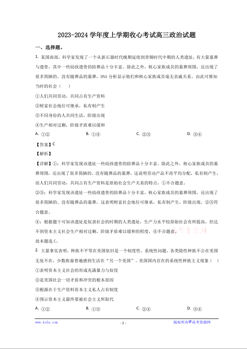 山东省淄博市第五中学2024届高三上学期开学政治(解析版)