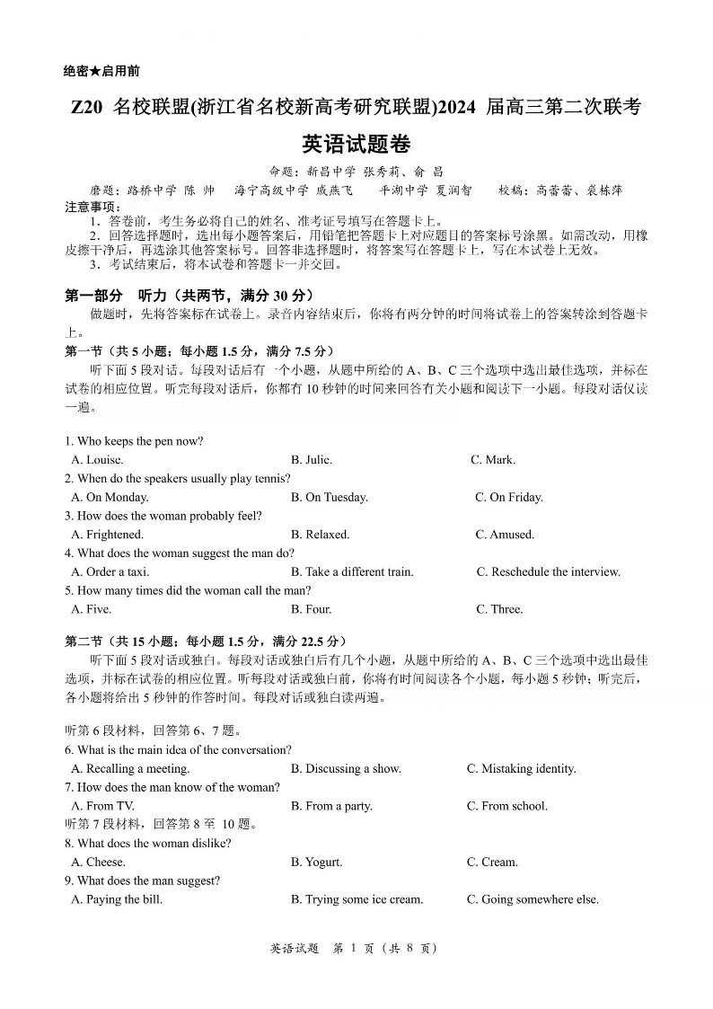 浙江省Z20名校联盟(浙江省名校新高考研究联盟)2023-2024学年高三第二次联考英语
