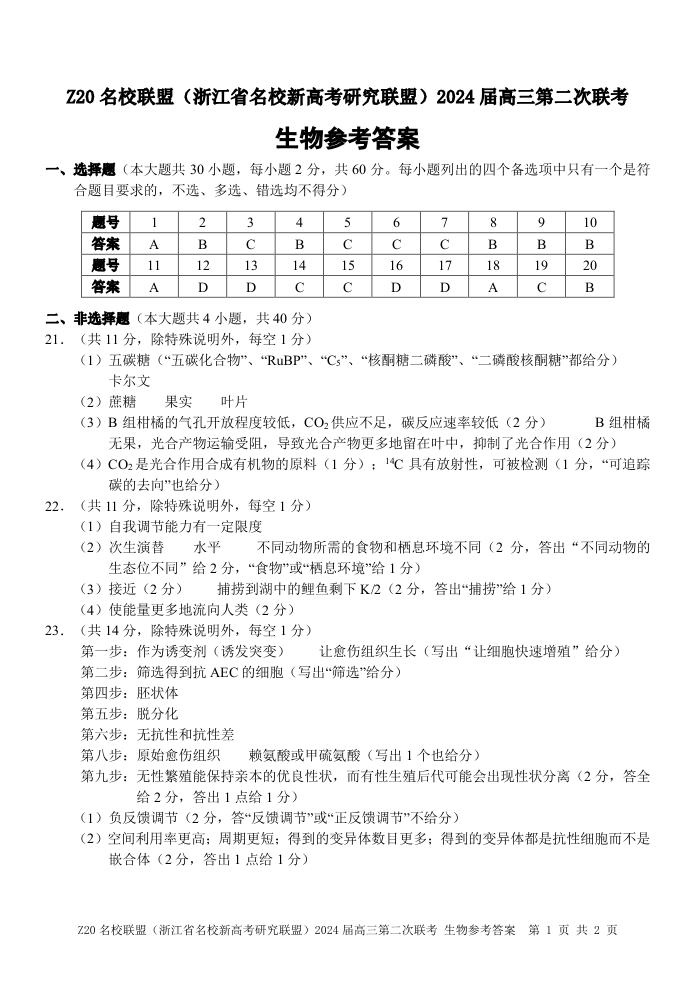 浙江省Z20名校联盟(浙江省名校新高考研究联盟)2023-2024学年高三第二次联考生物答案