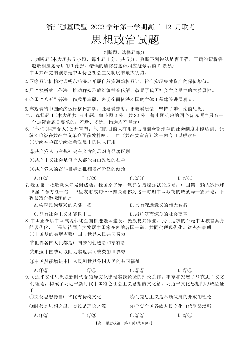 浙江强基联盟2024届第一学期高三12月联考政治