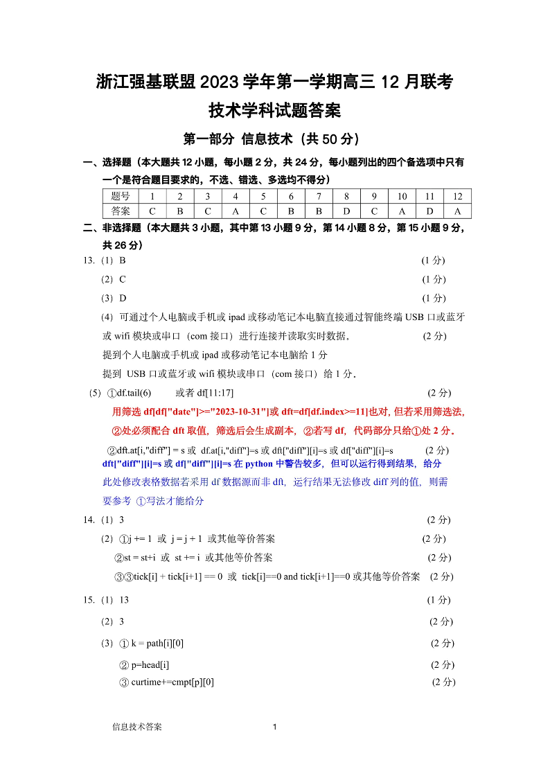浙江强基联盟2024届第一学期高三12月联考技术答案