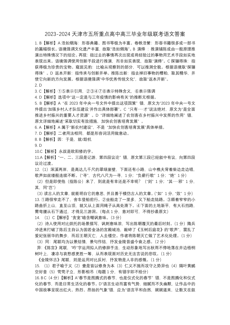 天津市五所重点高中2024届高三上学期12月联考语文答案