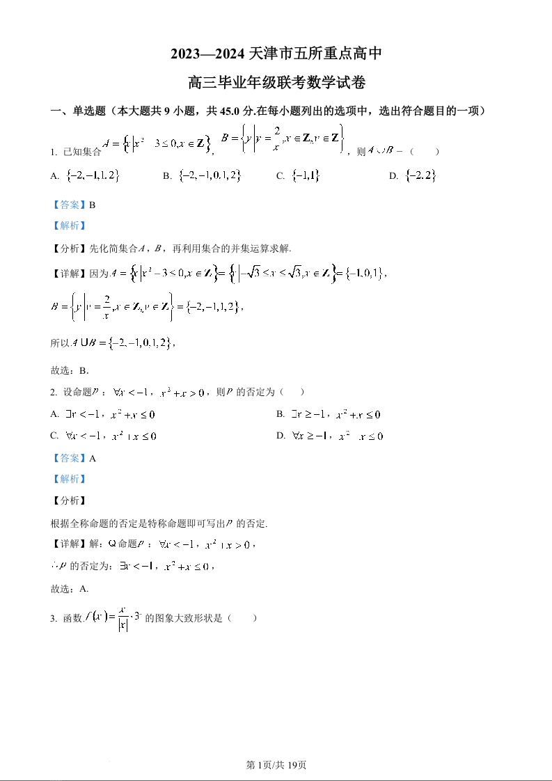 天津市五所重点高中2024届高三上学期12月联考数学(精品解析版)