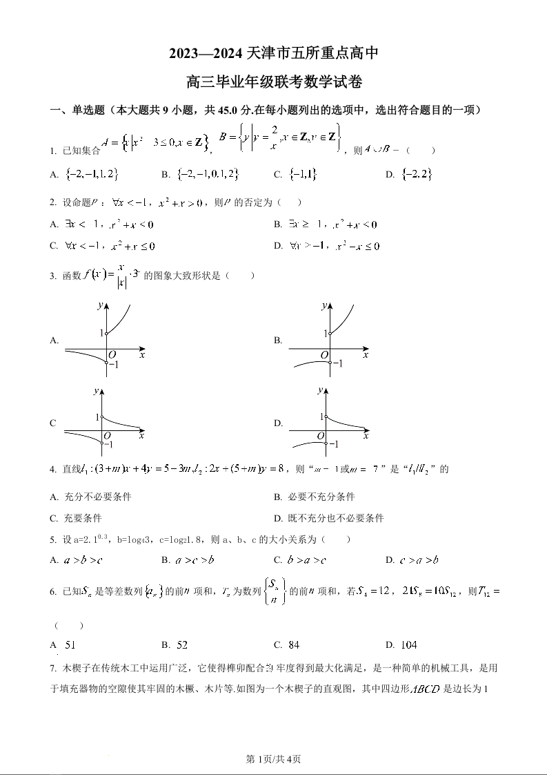 天津市五所重点高中2024届高三上学期12月联考数学(原卷版)